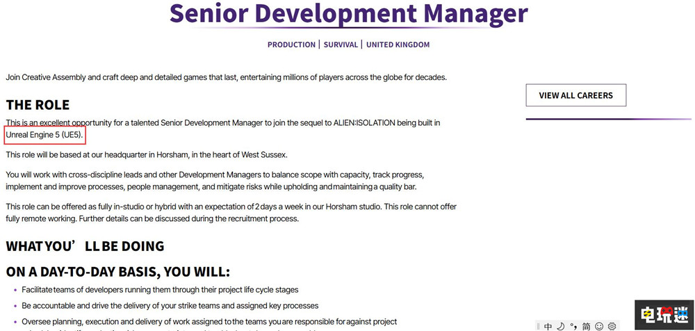 同时根据Creative Assembly的招聘信息,在高级开发经理职位的介绍中提及该职位将加入《异形:隔离2》的开发,而这款游戏将采用虚幻5引擎打造。在《异形:隔离2》的宣传片中提及了ESRB评级待定的标签,这可能代表游戏已经步入最后冲刺阶段。早在2024年,初代发售十周年时,游戏创意总监艾尔·霍普确认《异形:隔离》的续作正在早期开发。如今已经过去一年,如果官方依旧采用系列经典的原版电影艺术风格,那么很多初代素材都可以重复利用,游戏的开发或许会更快。